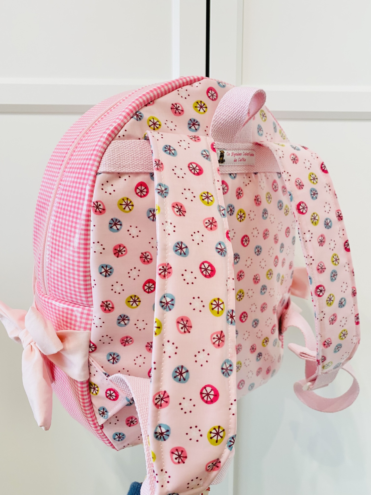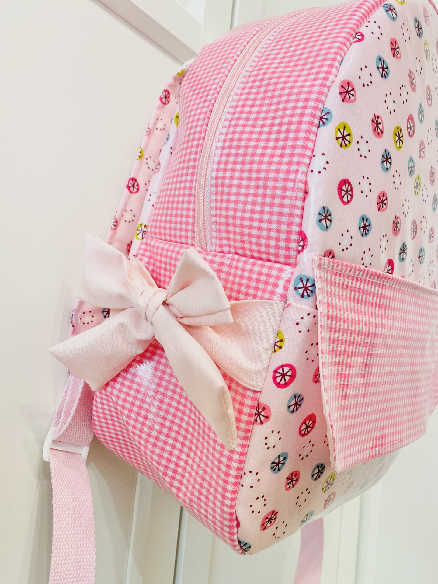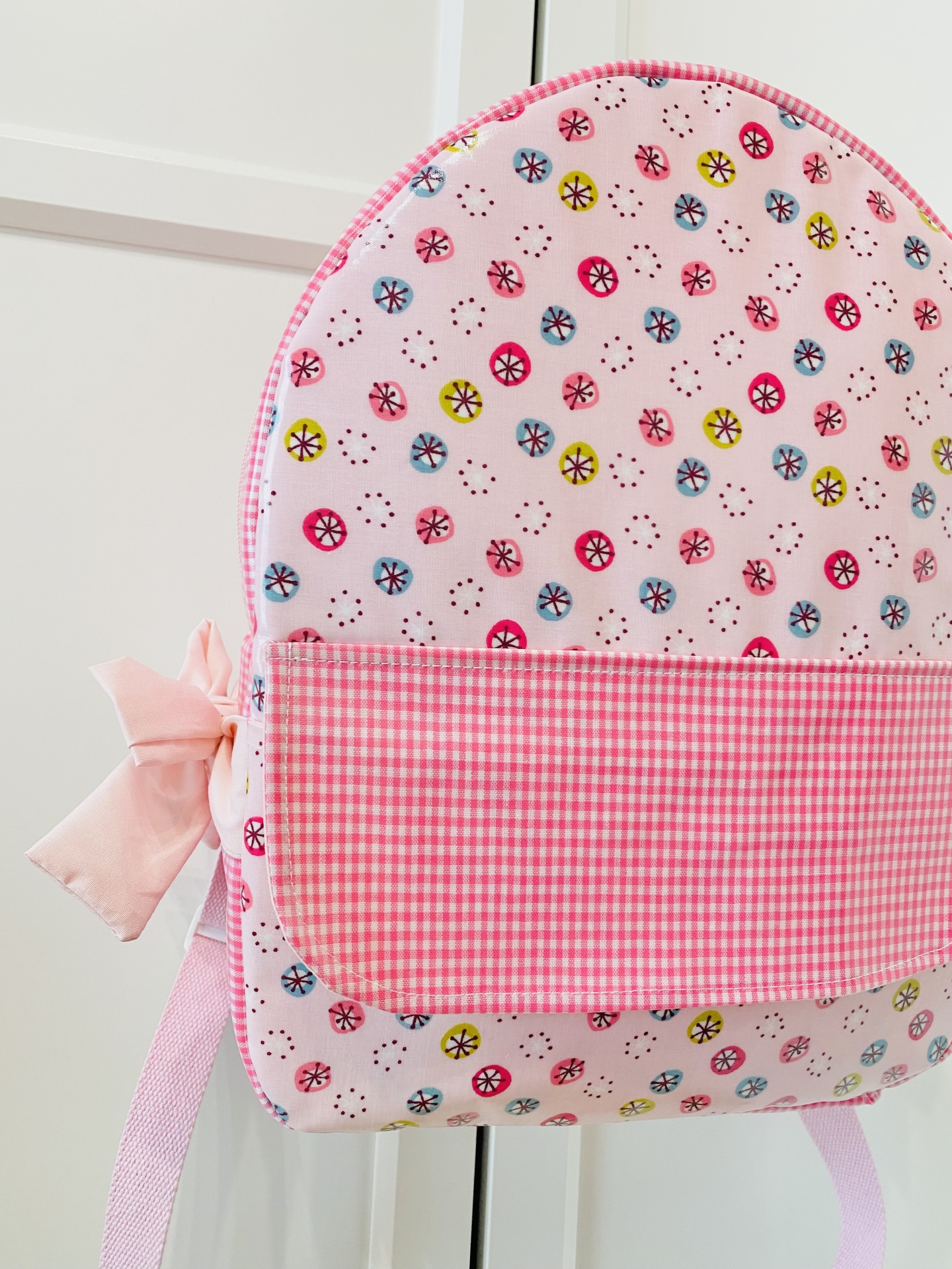 Mochila de tecido plastificado no exterior e tecido de algodão no interior.
