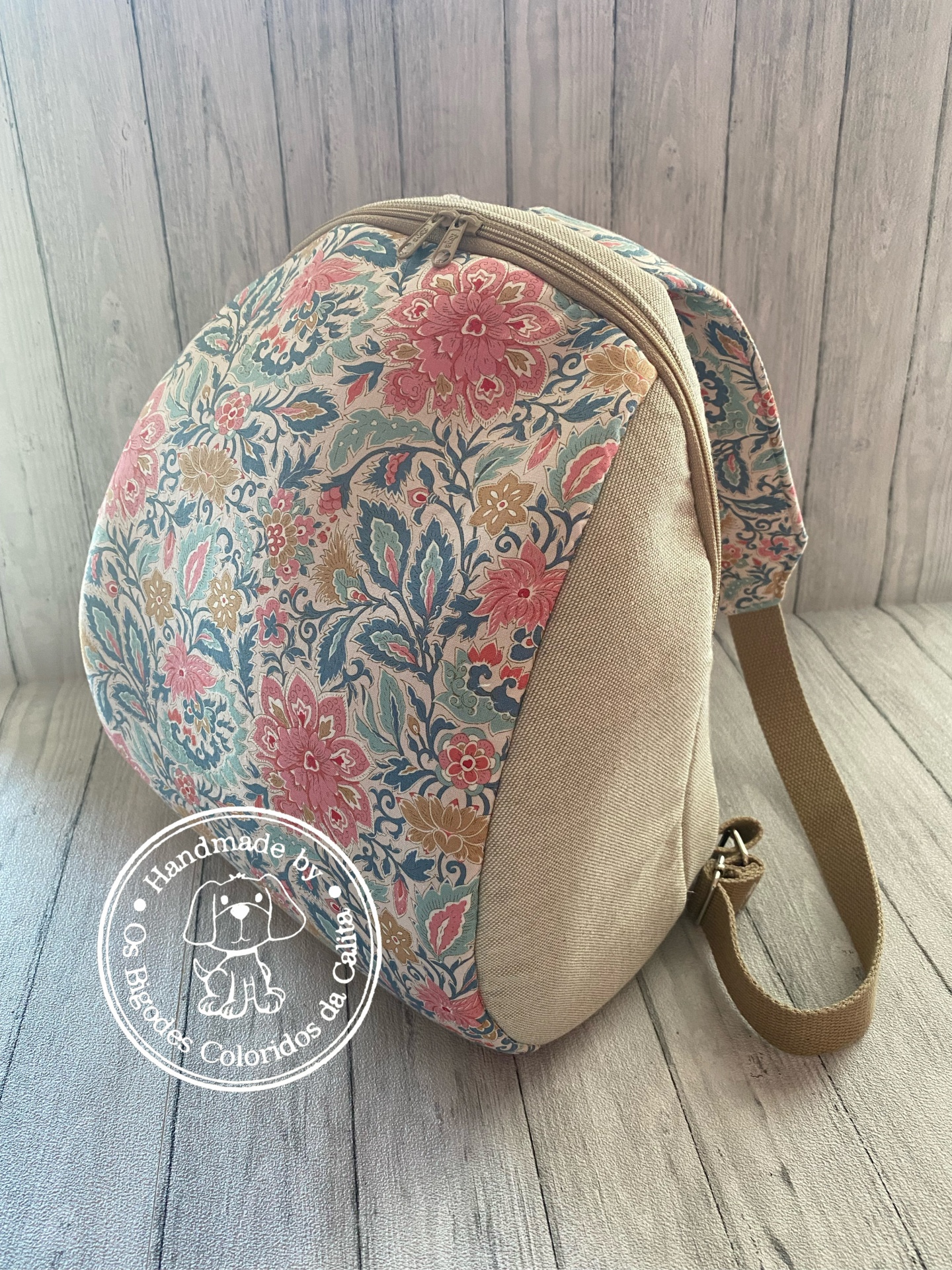 Mochila em tecidos de algodão, estruturada e com alças reguláveis.