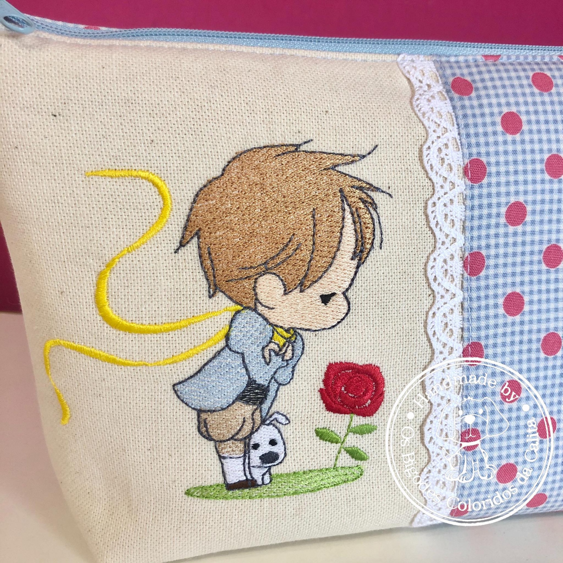Necessaire de tecido de algodão, bordada com desenho. Fecho zipper. Interior em algodão.