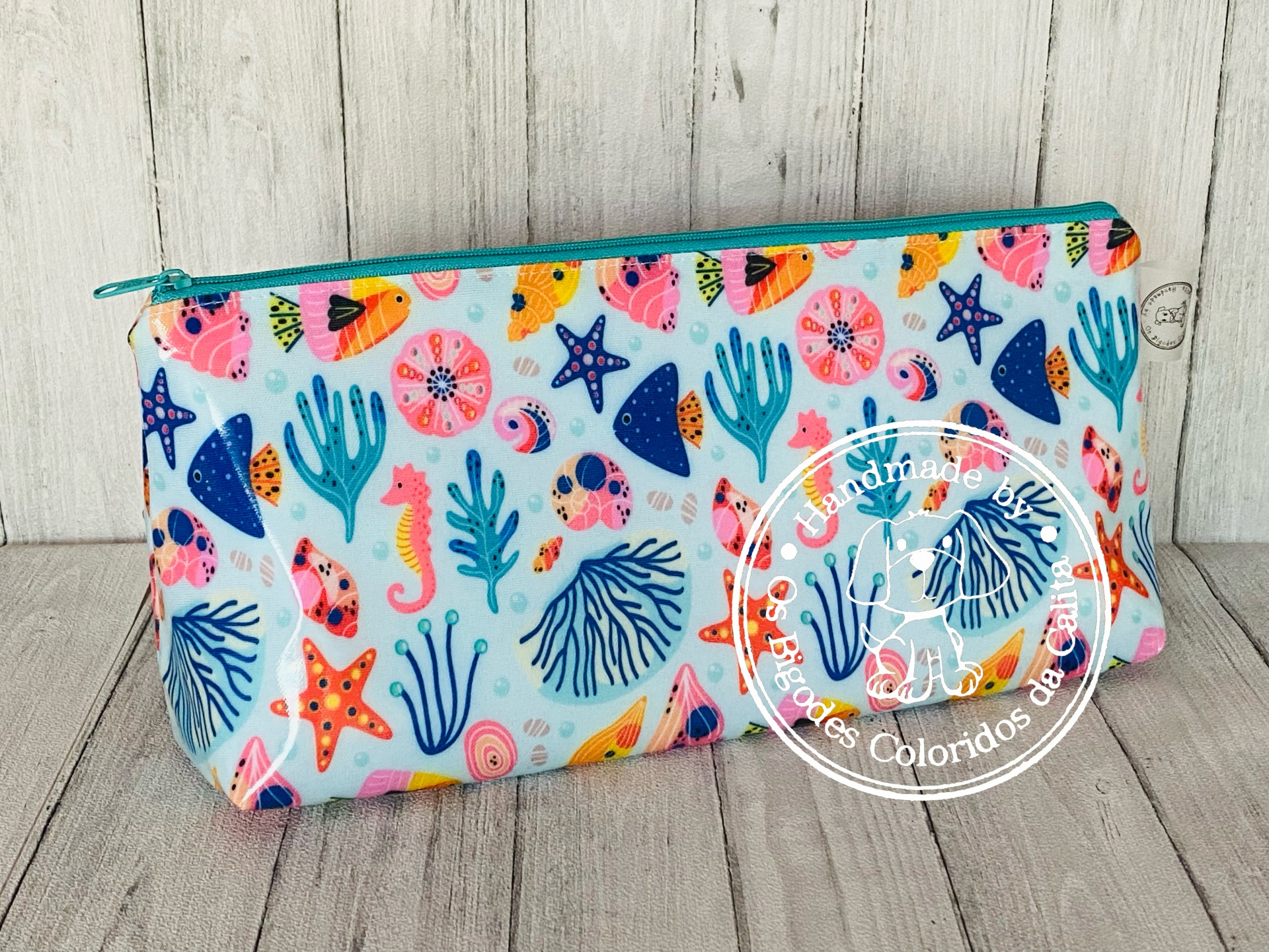 Necessaire plastificad interior e exteriormente, com fecho zipper.