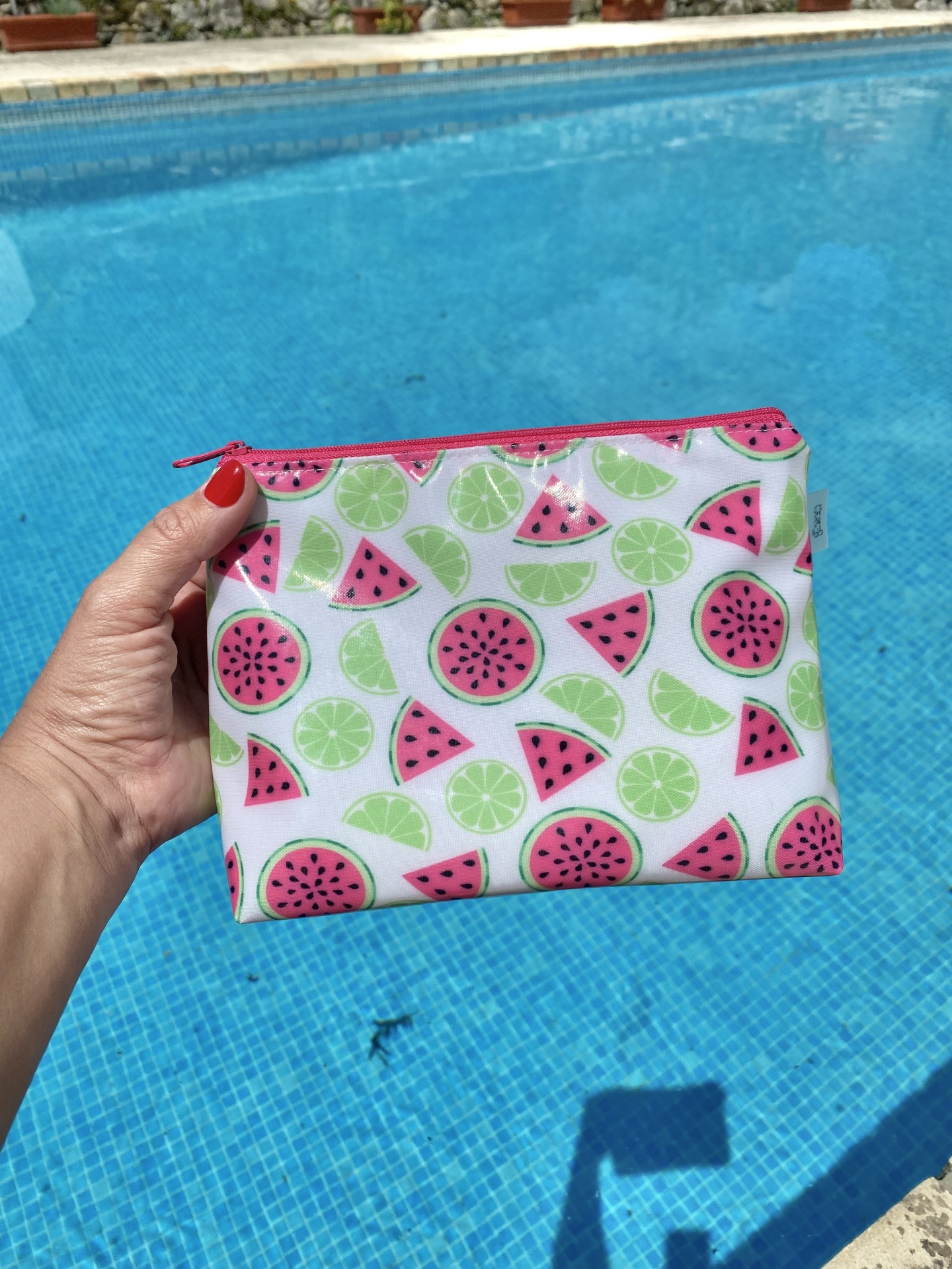 Necessaire feita em tecido plastificado no exterior e com plastificado branco no interior.