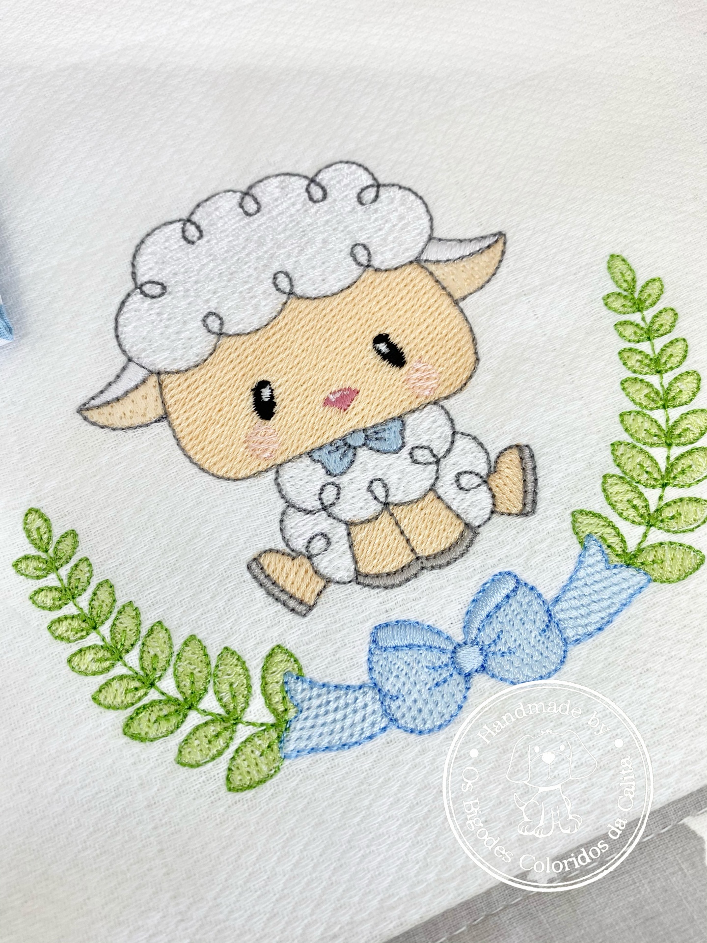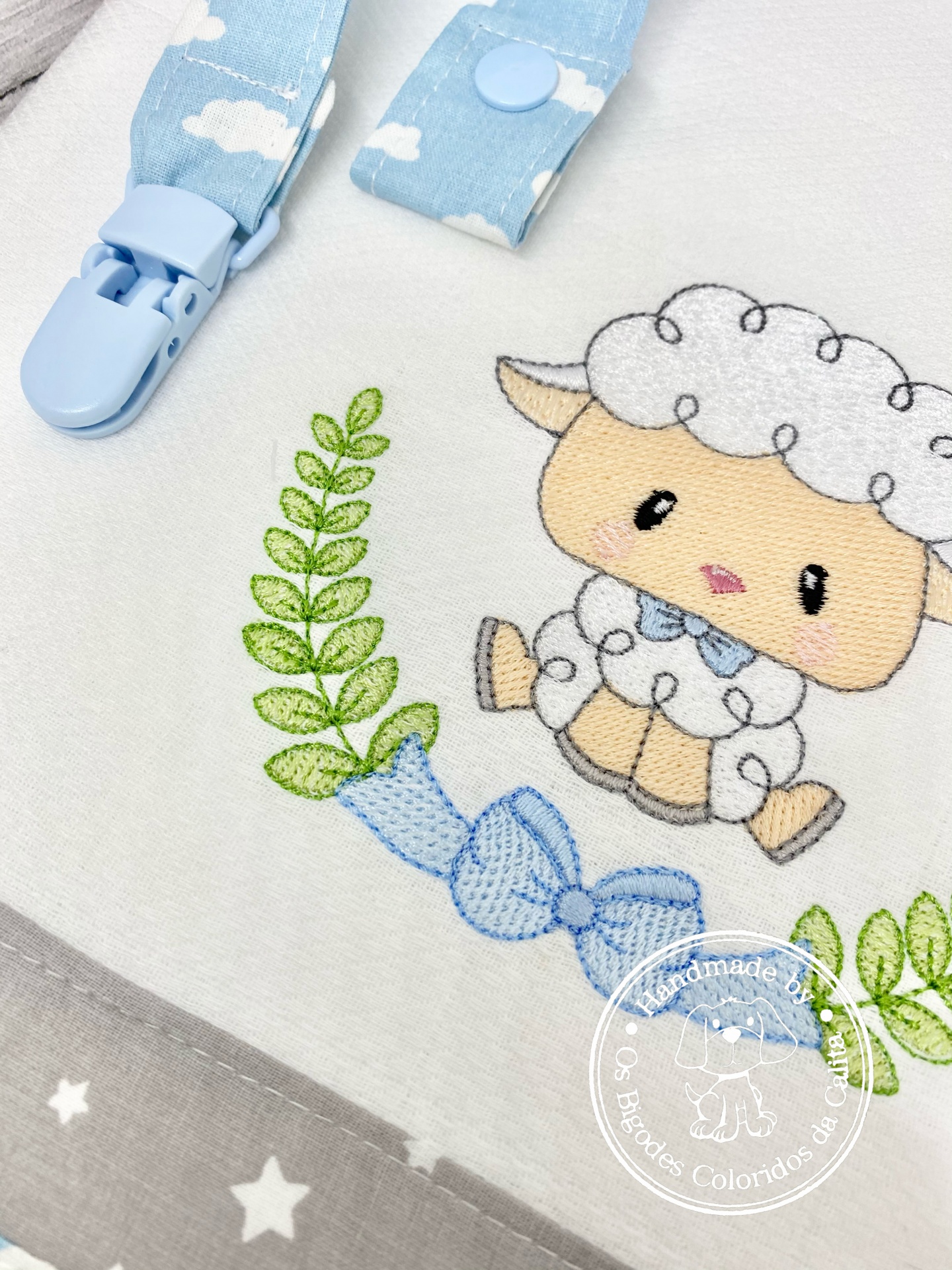 Conjunto composto por fralda de algodão bordada e prende chucha