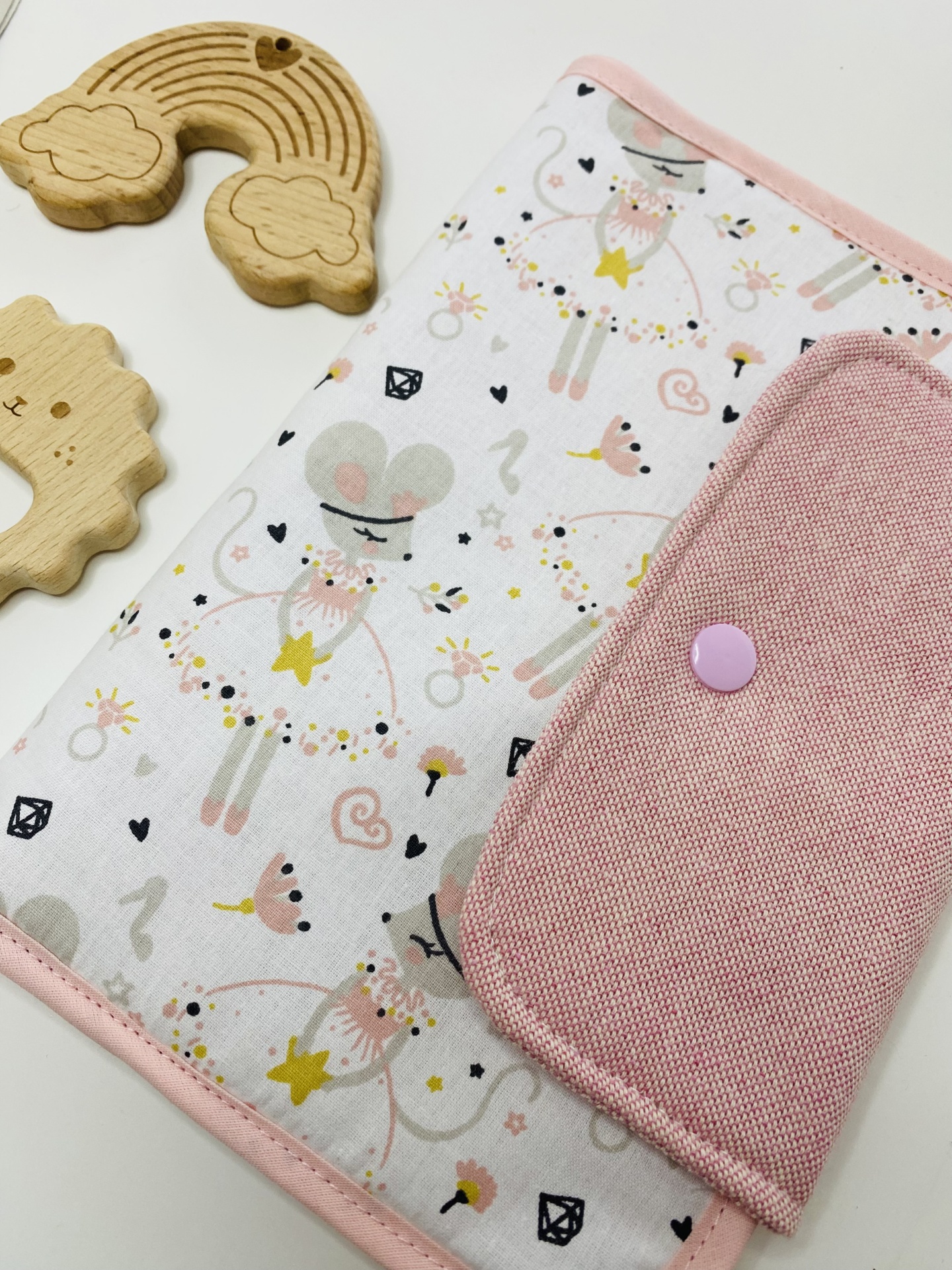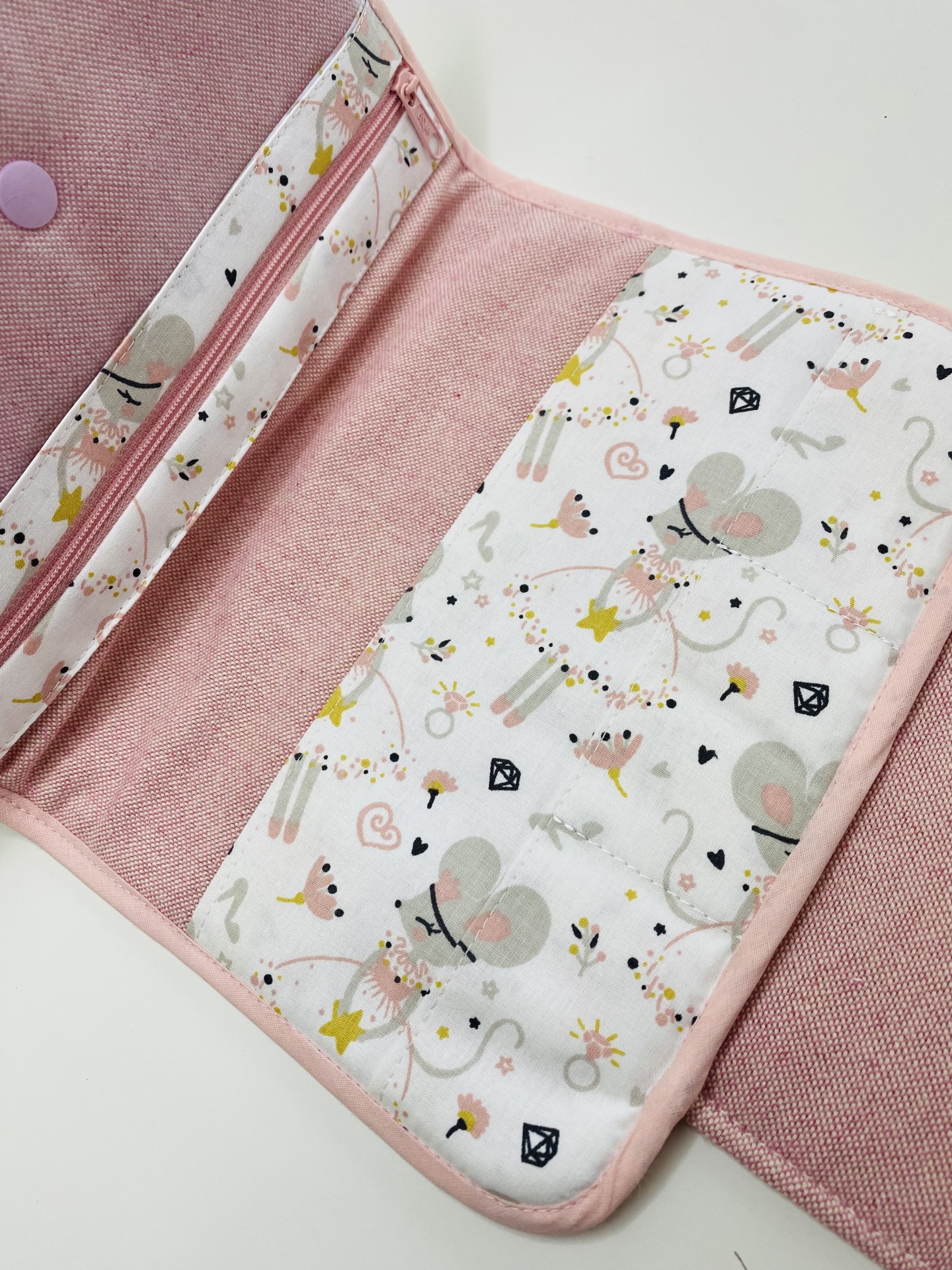 Porta documentos de criança. Espaço para a caderneta de saúde, boletim de vacinas, cartões e outros documentos do bebé. Tecidos de algodão. Parte interior com divisória em plastico maleável com fecho.