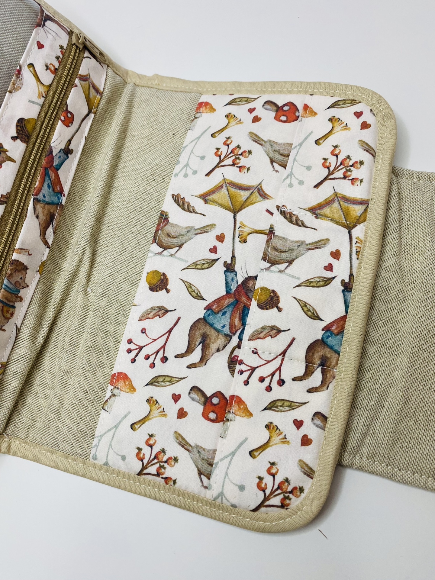 Porta documentos de criança. Espaço para a caderneta de saúde, boletim de vacinas, cartões e outros documentos do bebé. Tecidos de algodão. Parte interior com divisória em plastico maleável com fecho.