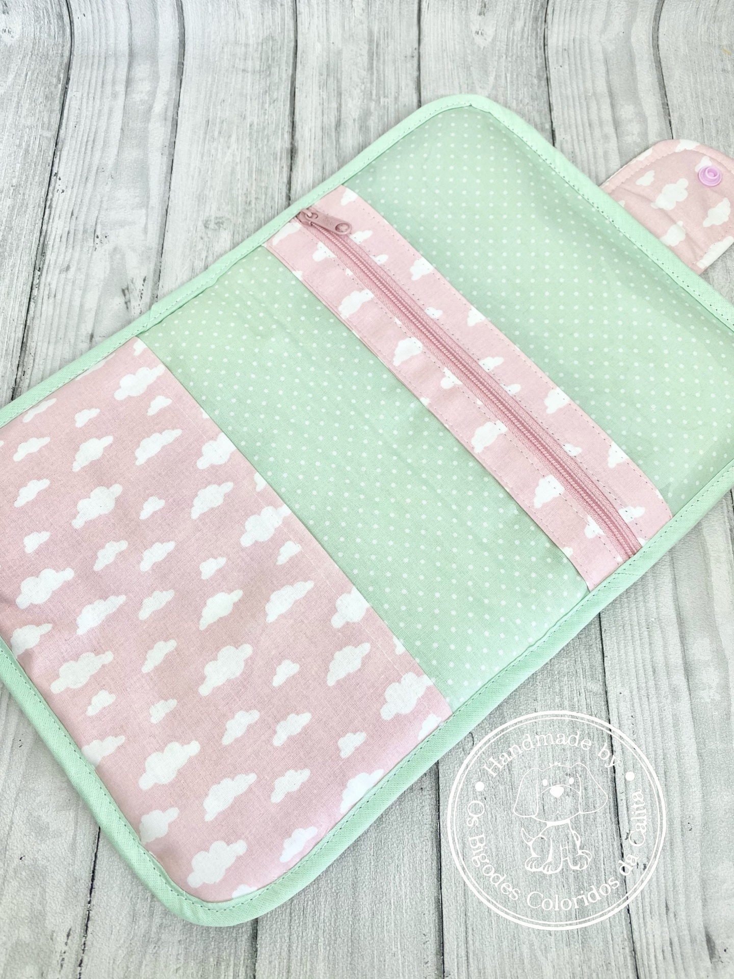 Porta documentos de criança. Espaço para a caderneta de saúde, boletim de vacinas, cartões e outros documentos do bebé. Tecidos de algodão. Parte interior com divisória em plastico maleável com fecho.