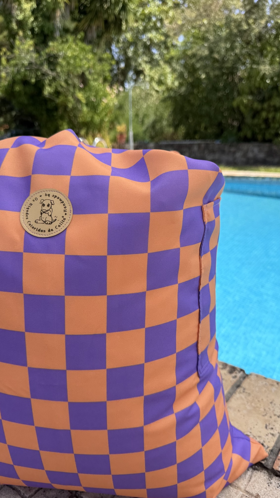 Tem também uma pega na lateral para levar o puff/saco pela mão, sem ser com a alça comprida.