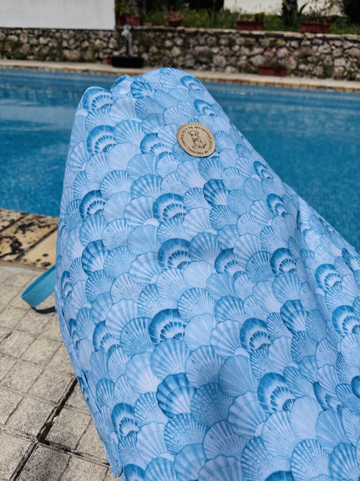 Tecido de 100% poliéster que leva um tratamento para que fique impermeável, ou seja repele a água, não fica mancha do sal do mar e não deixa passar humidade.