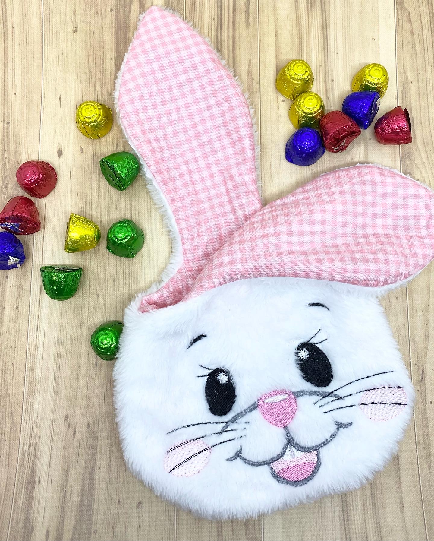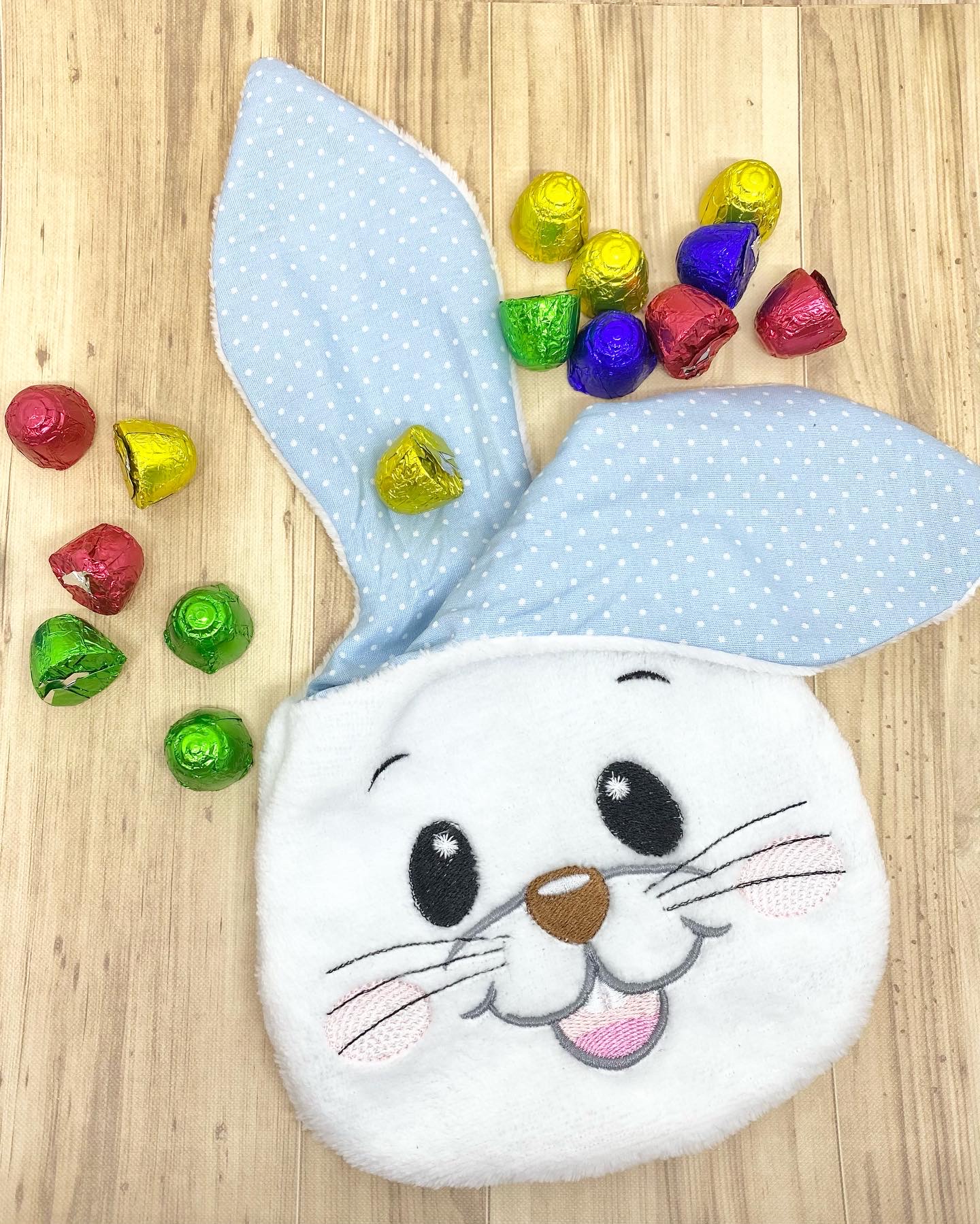 Saco em forma de cabeça de coelhinho da Páscoa. Feito em algodão e em coralina para que seja mais fofo ainda.