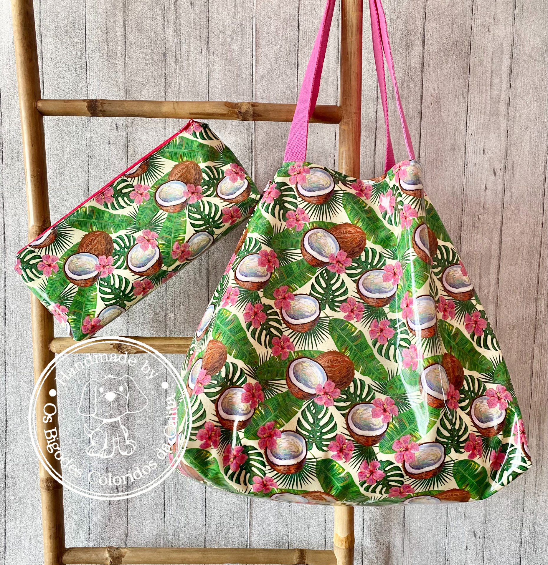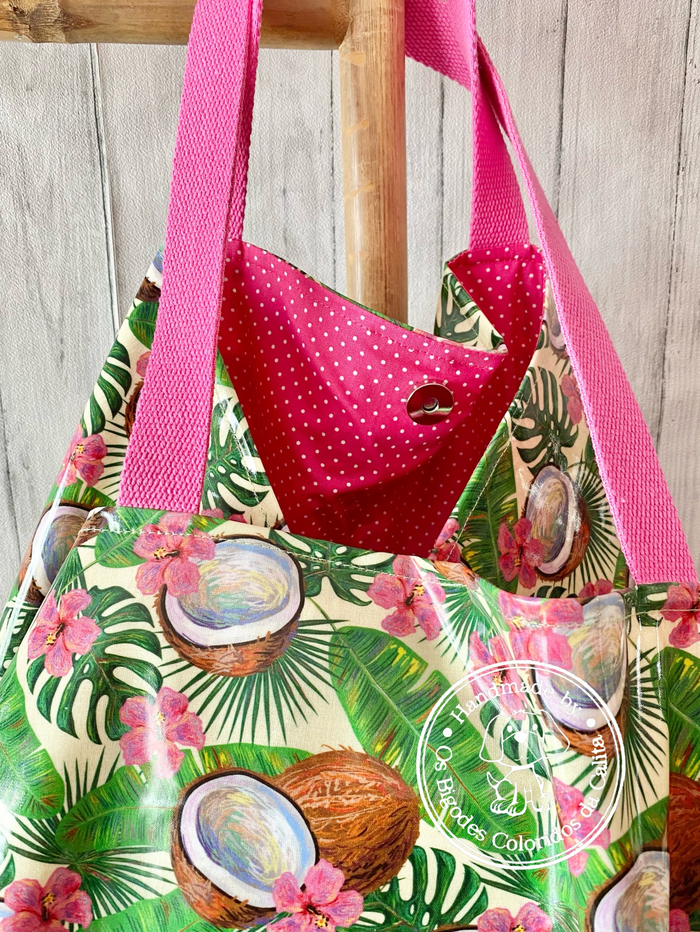 Saco para a praia feito com tecido plastificado por fora e forrado com tecido de algodão.