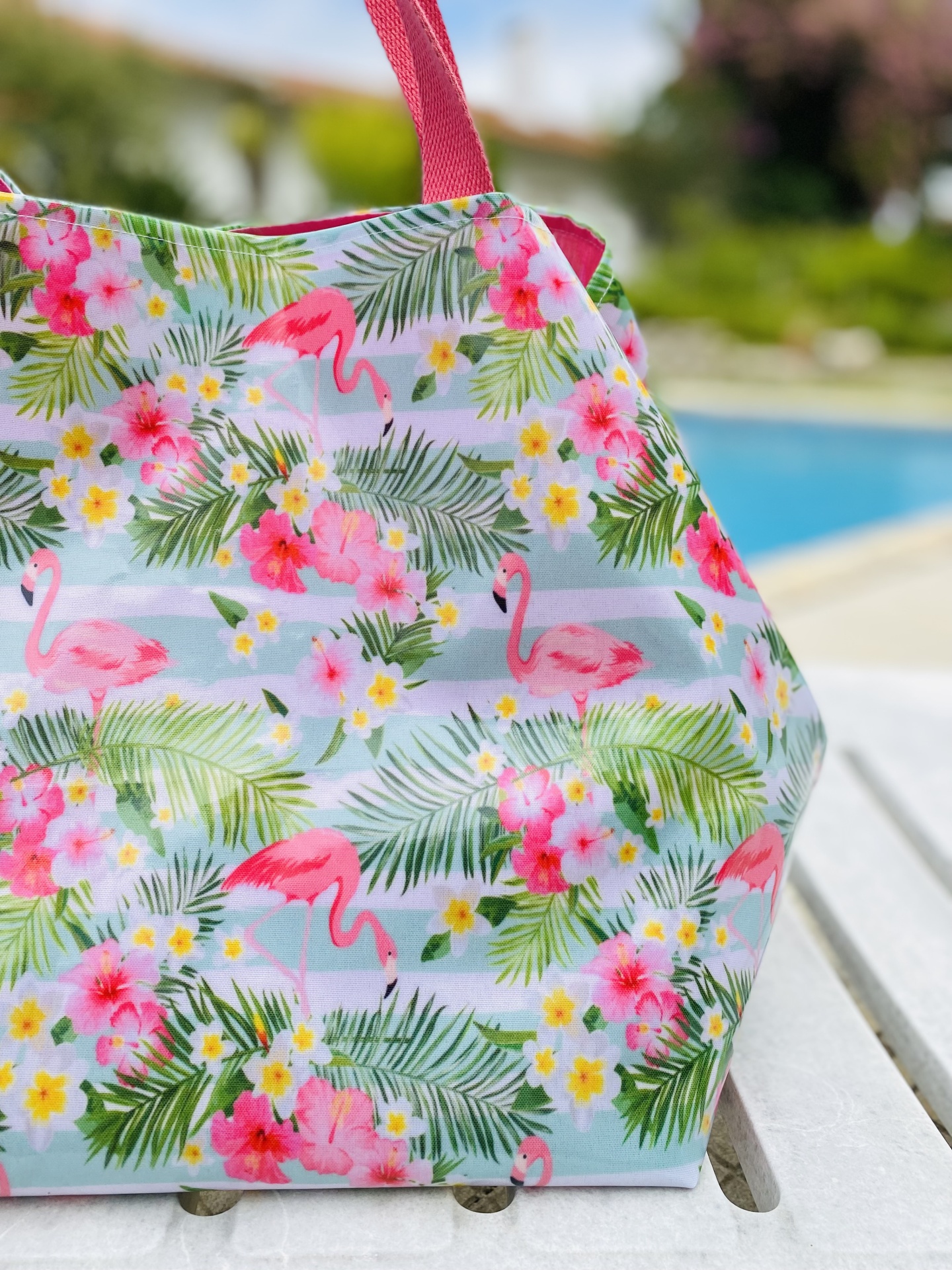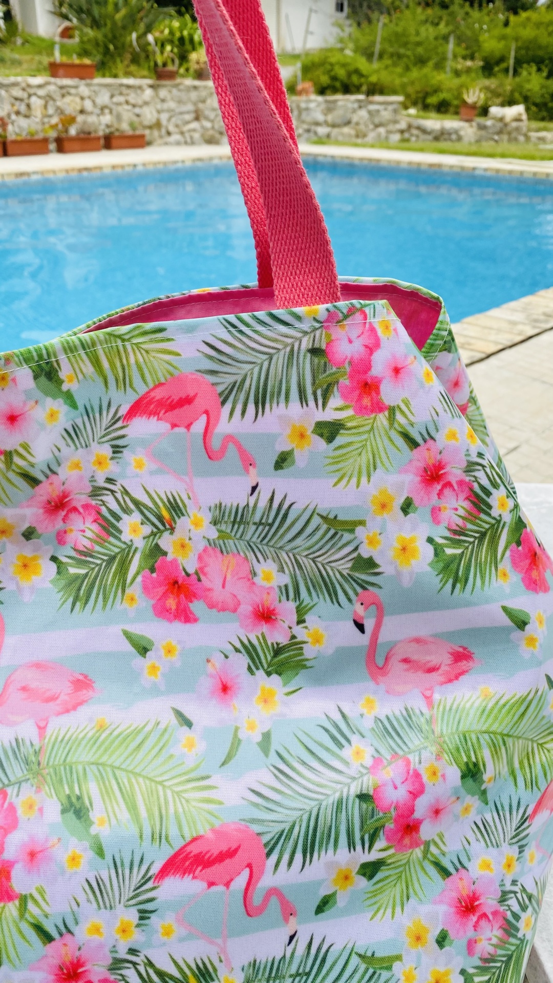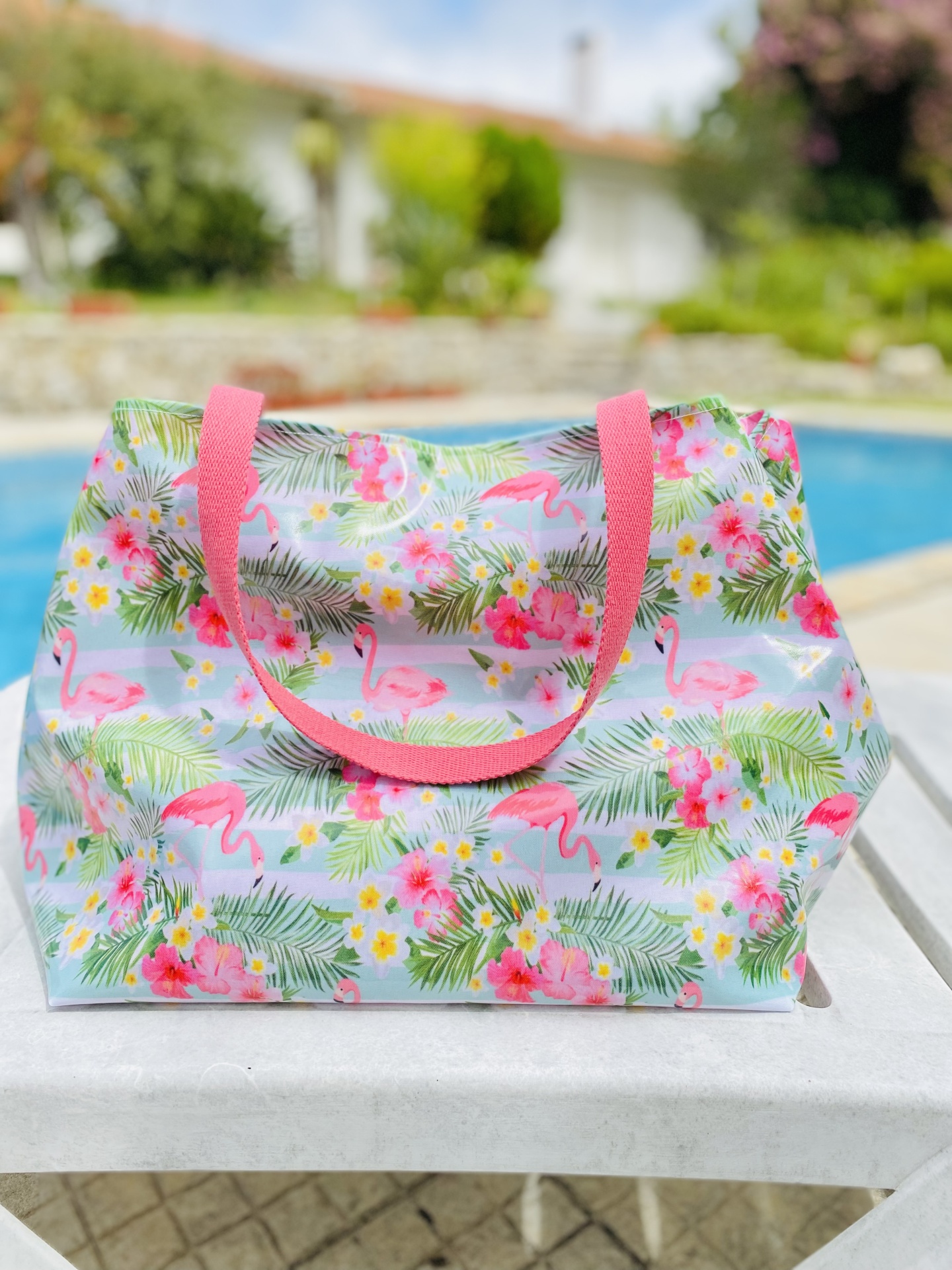 Saco para a praia feito com tecido plastificado por fora e forrado com tecido de algodão. Alças de precinta de algodão. Tamanho XL, para caber tudo.