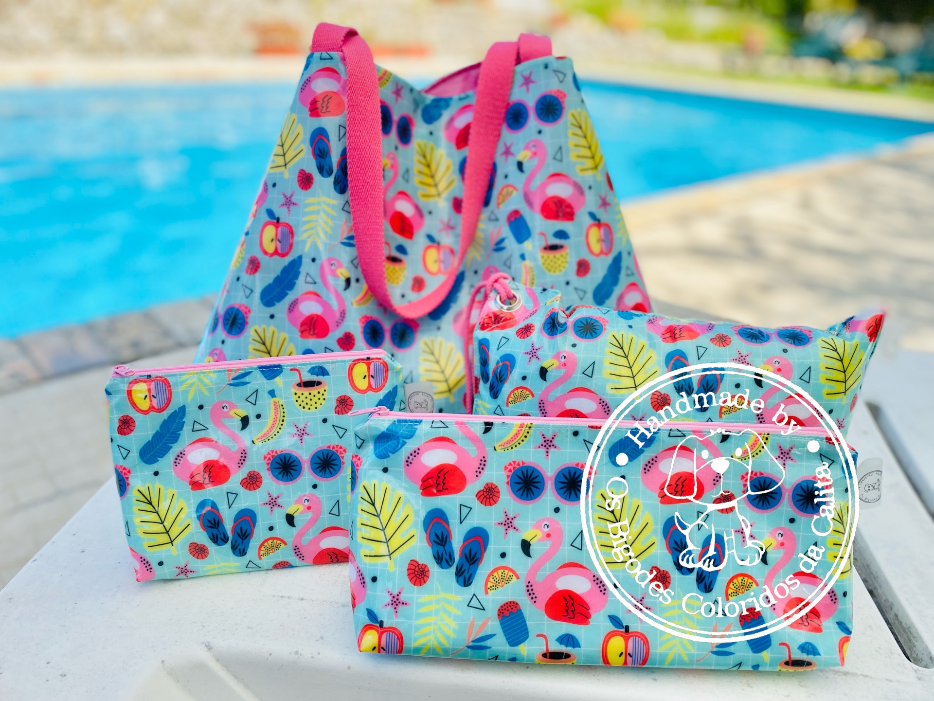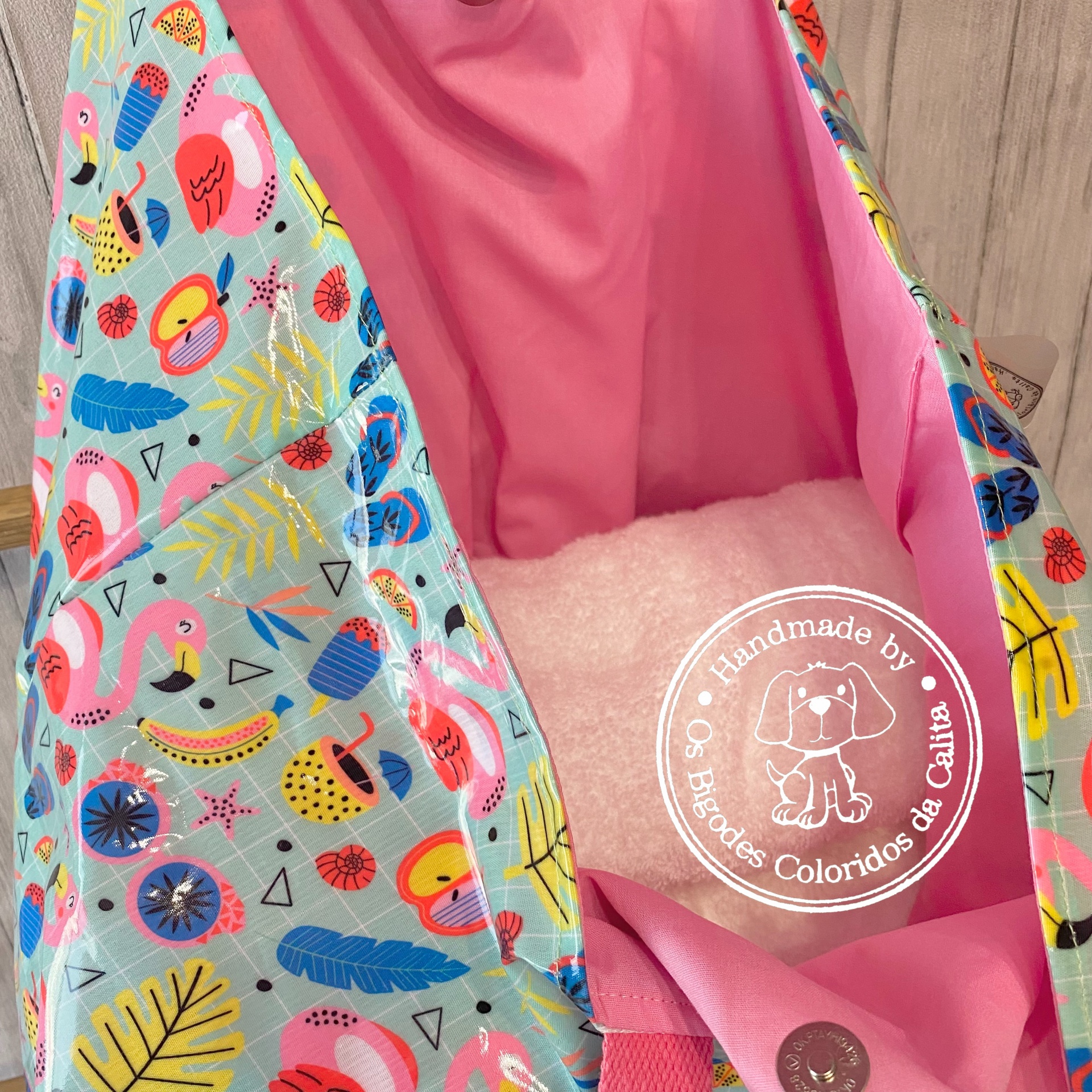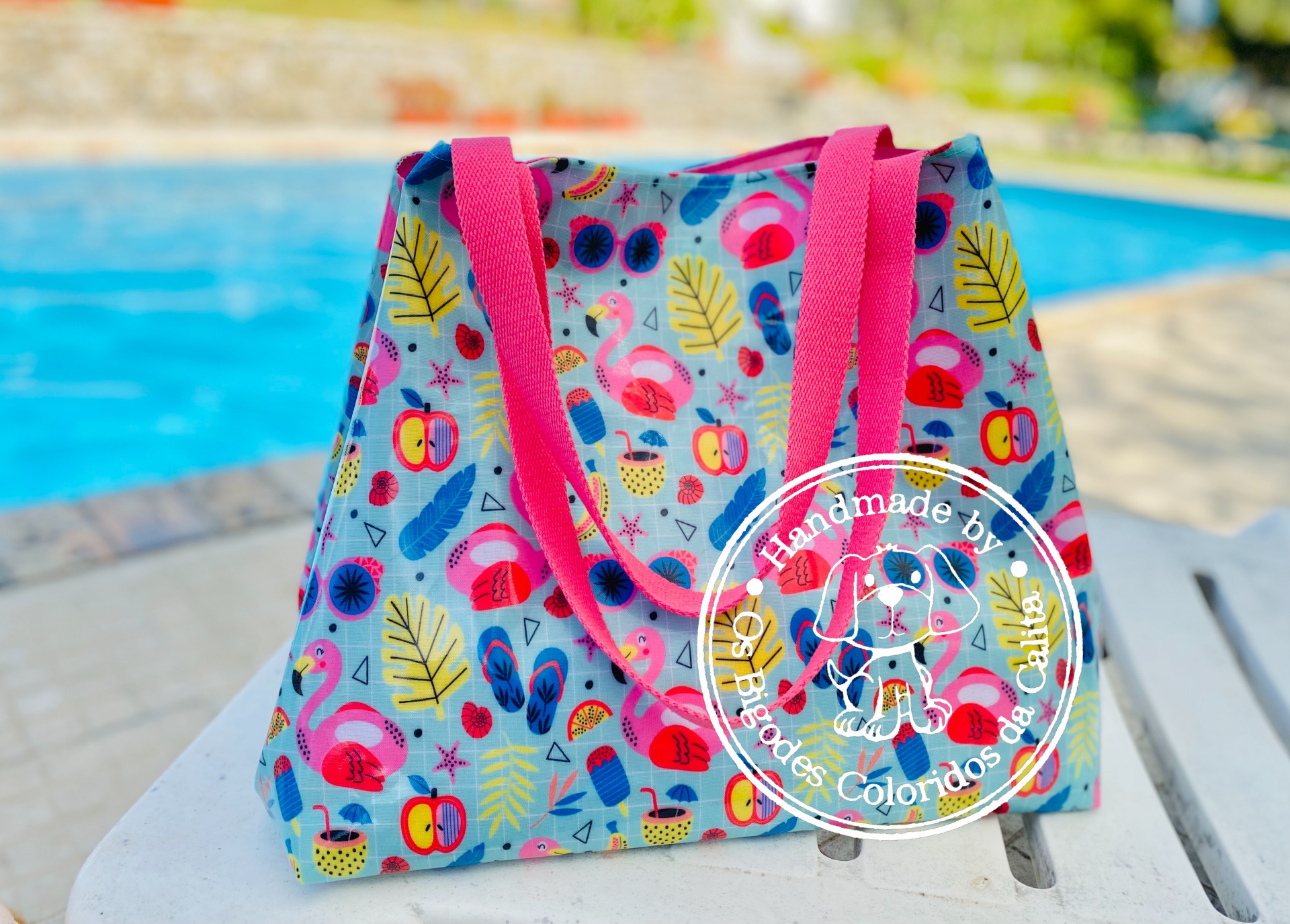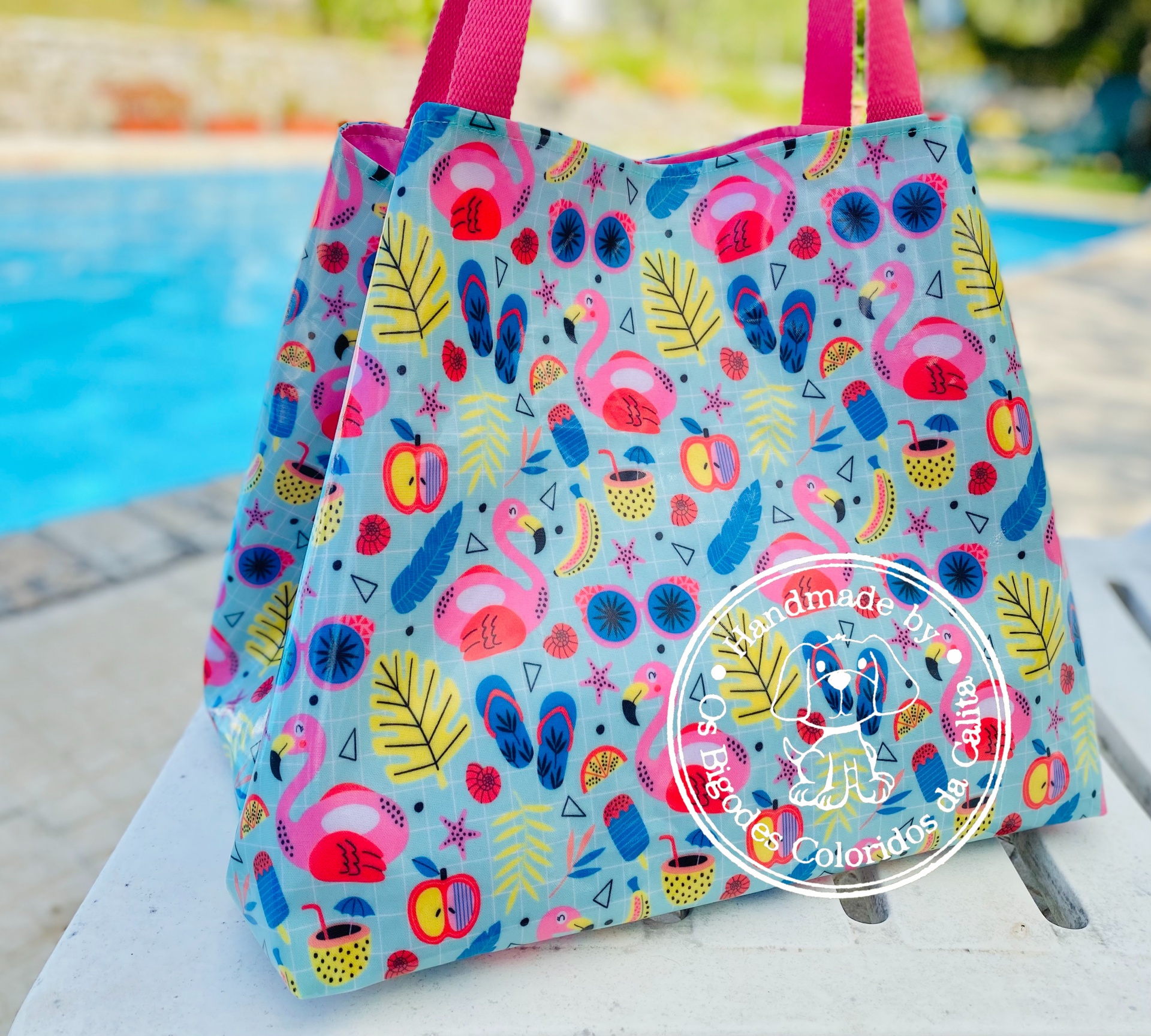 Saco para a praia feito com tecido plastificado por fora e forrado com tecido de algodão. Alças de precinta de algodão. Tamanho XL, para caber tudo.