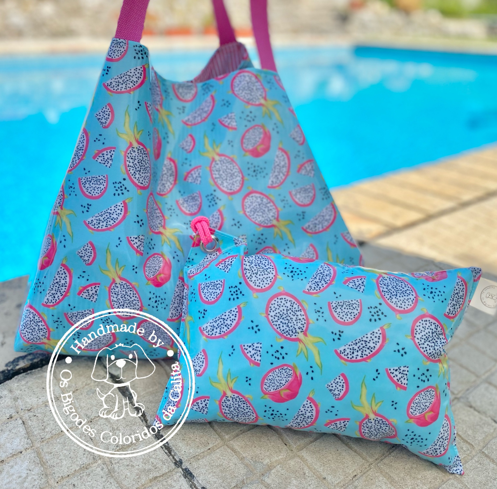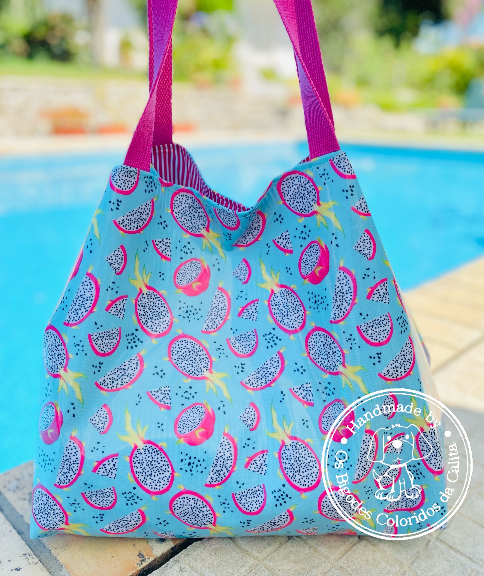 Saco para a praia feito com tecido plastificado por fora e forrado com tecido de algodão. Alças de precinta de algodão. Tamanho XL, para caber tudo.