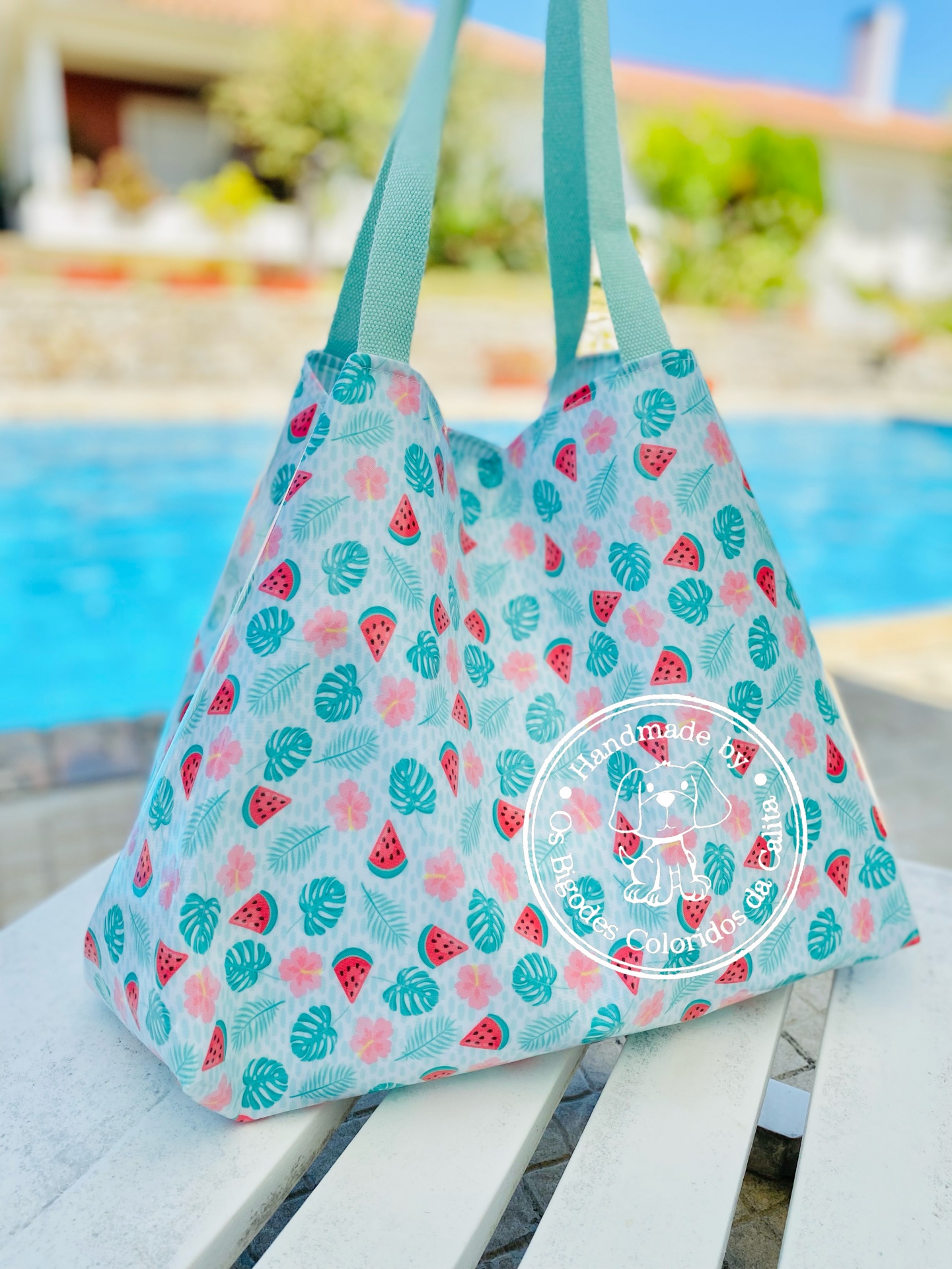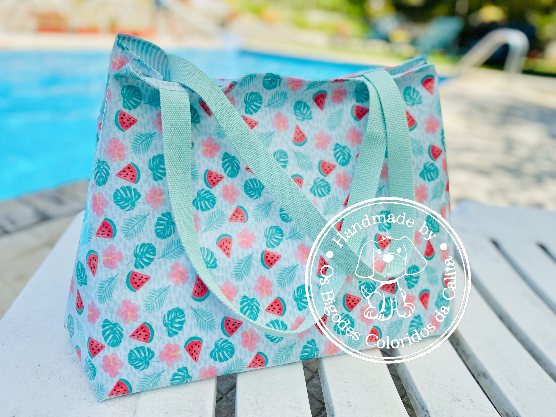 Saco para a praia feito com tecido plastificado por fora e forrado com tecido de algodão. Alças de precinta de algodão. Tamanho XL, para caber tudo.