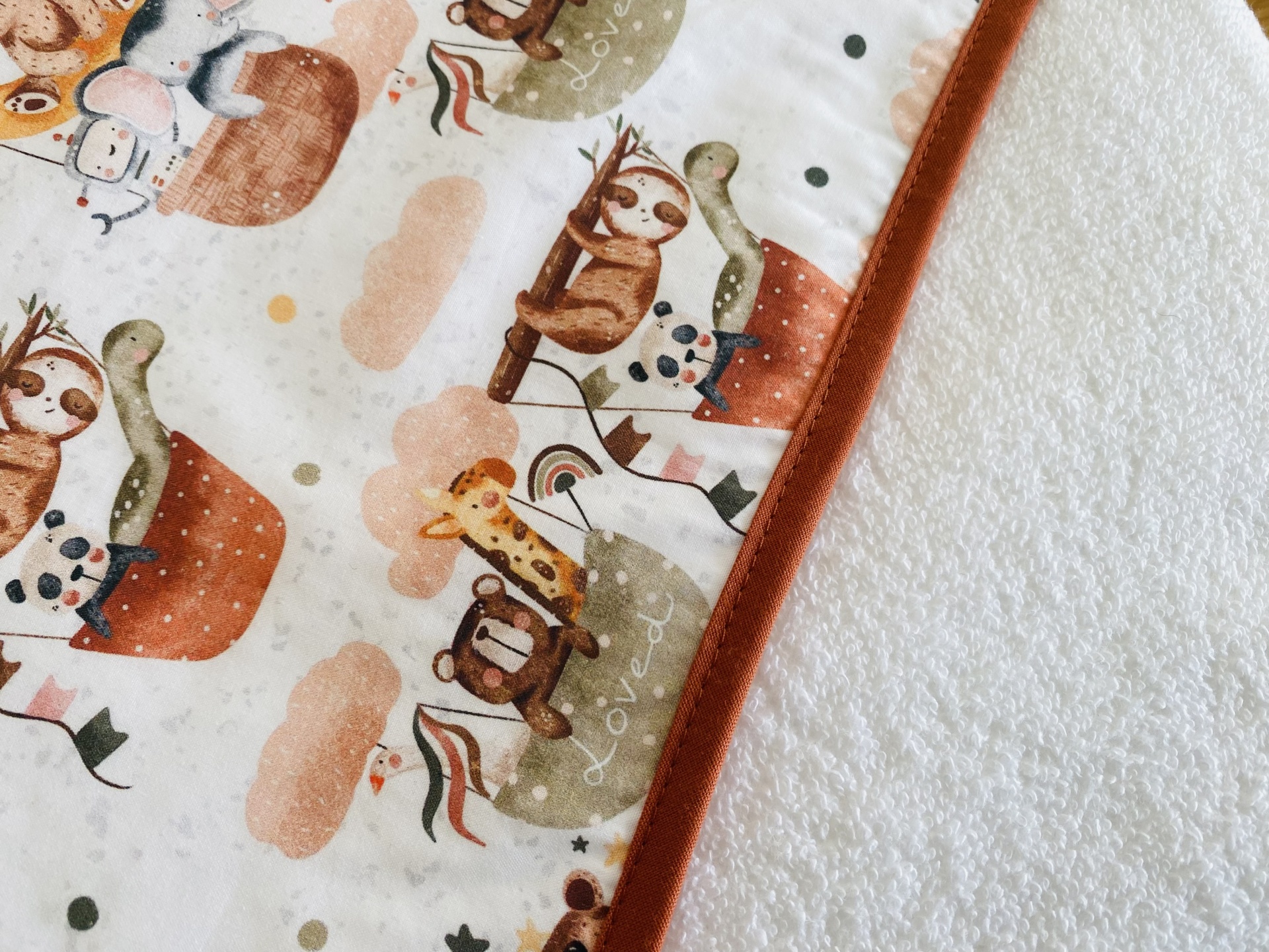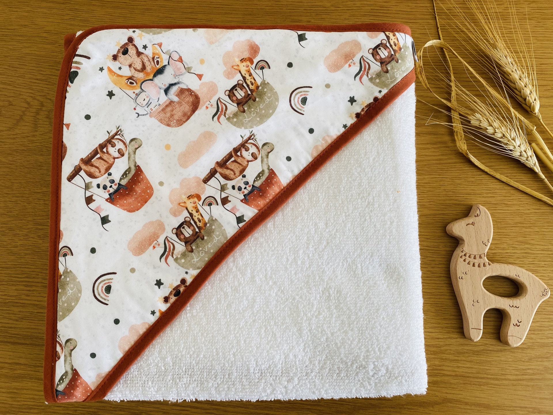 Toalha de banho com capuz, elaborada com tuco de algodão.