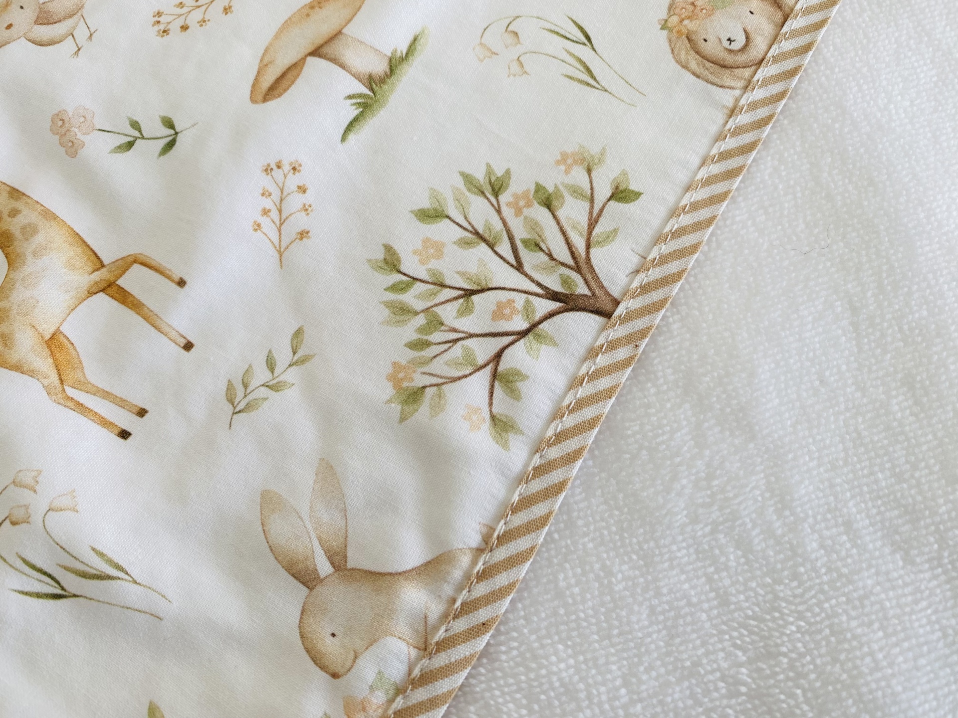Toalha de banho com capuz, elaborada com tuco de algodão.