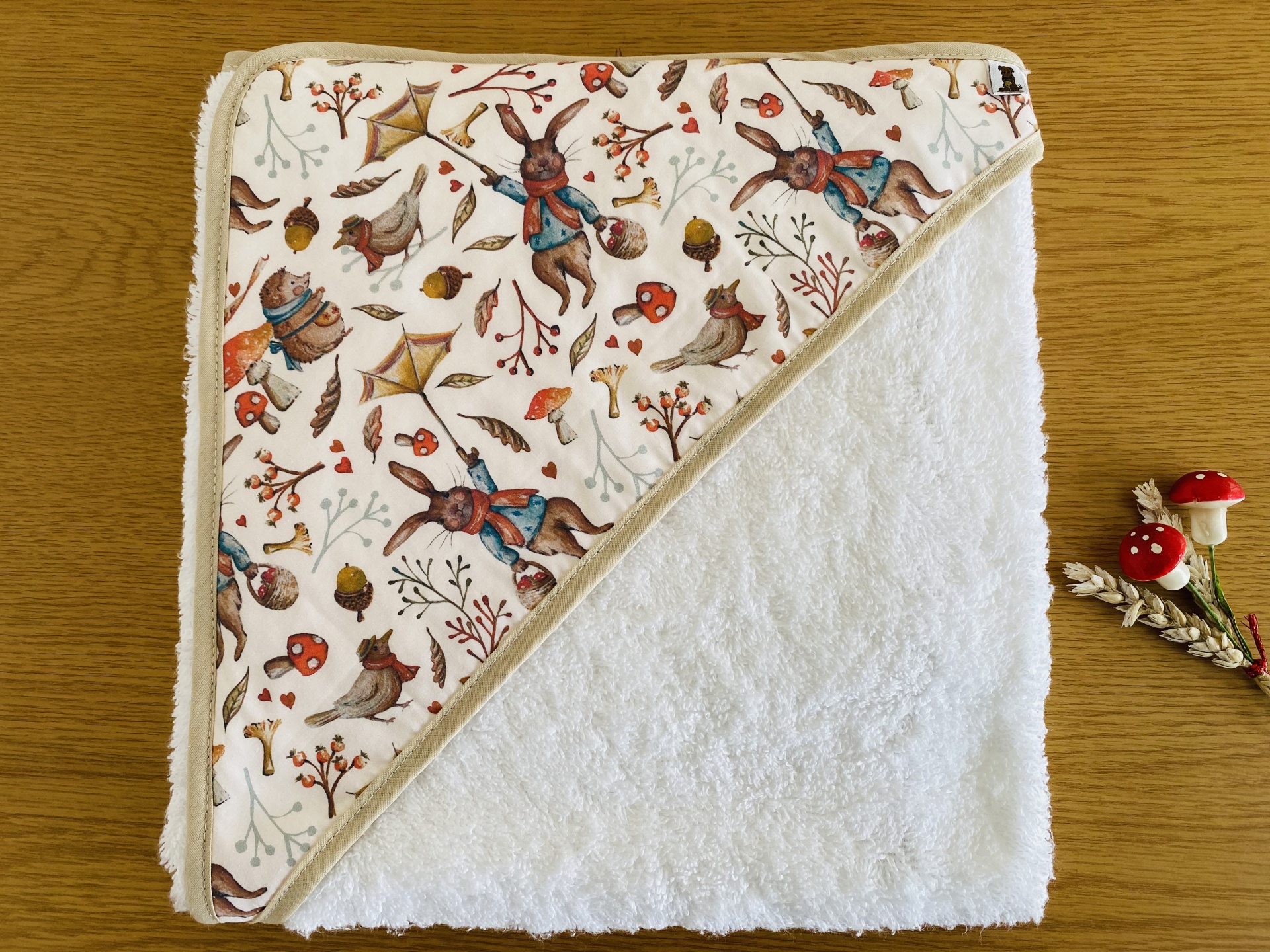 Toalha de banho com capuz, elaborada com tuco de algodão.