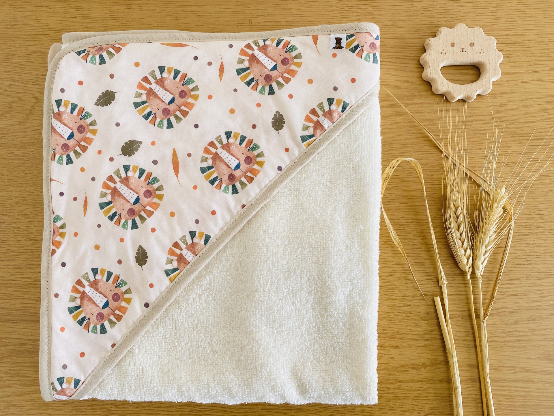 Toalha de banho com capuz, elaborada com tuco de algodão.