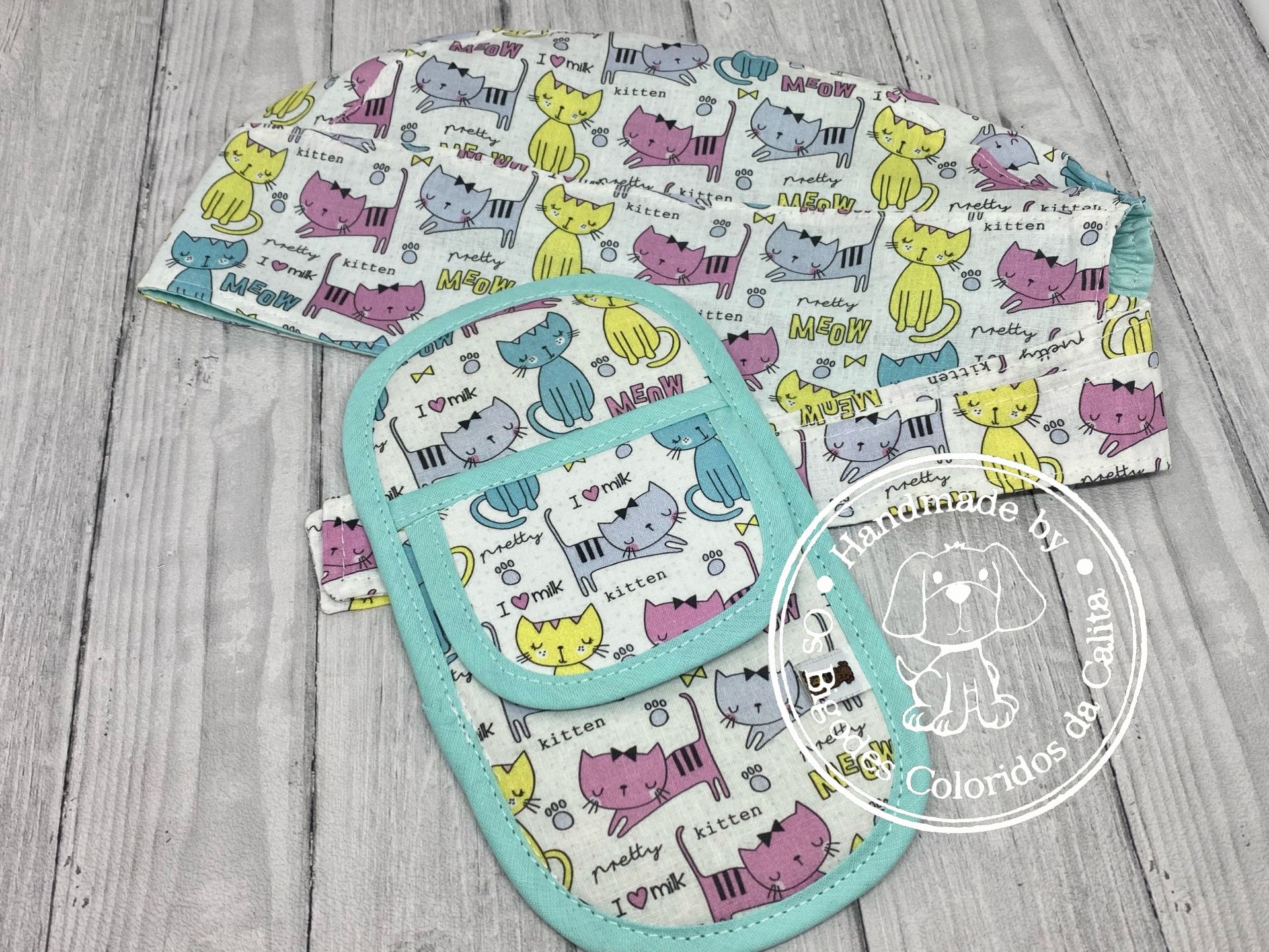 Touca cirúrgica ajustável em tecido de algodão. Forrada e reversível. Ajustável com elástico atrás e com fita para atar.