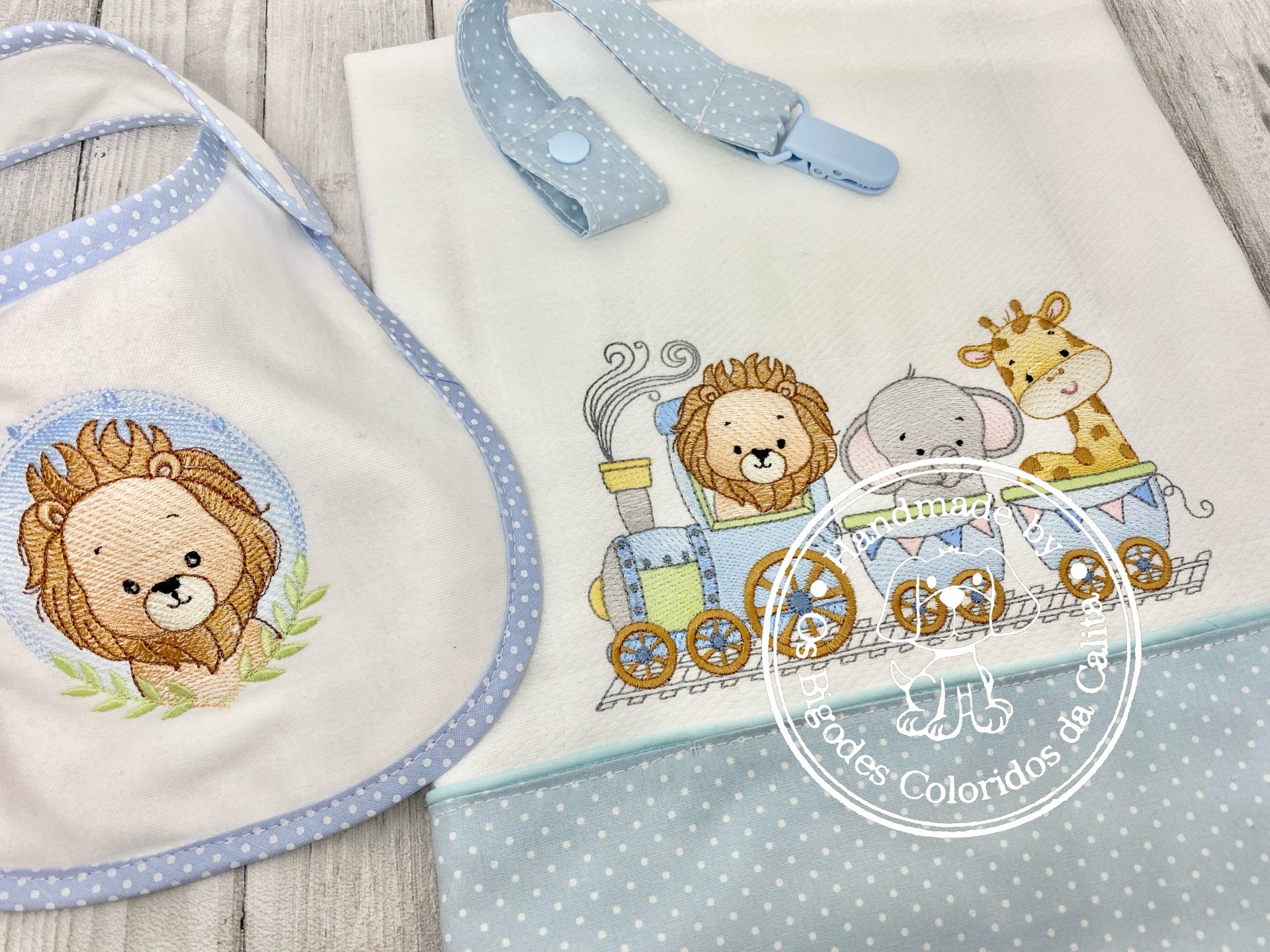 Conjunto composto por fralda de algodão bordada, babete bordado e prende chucha.