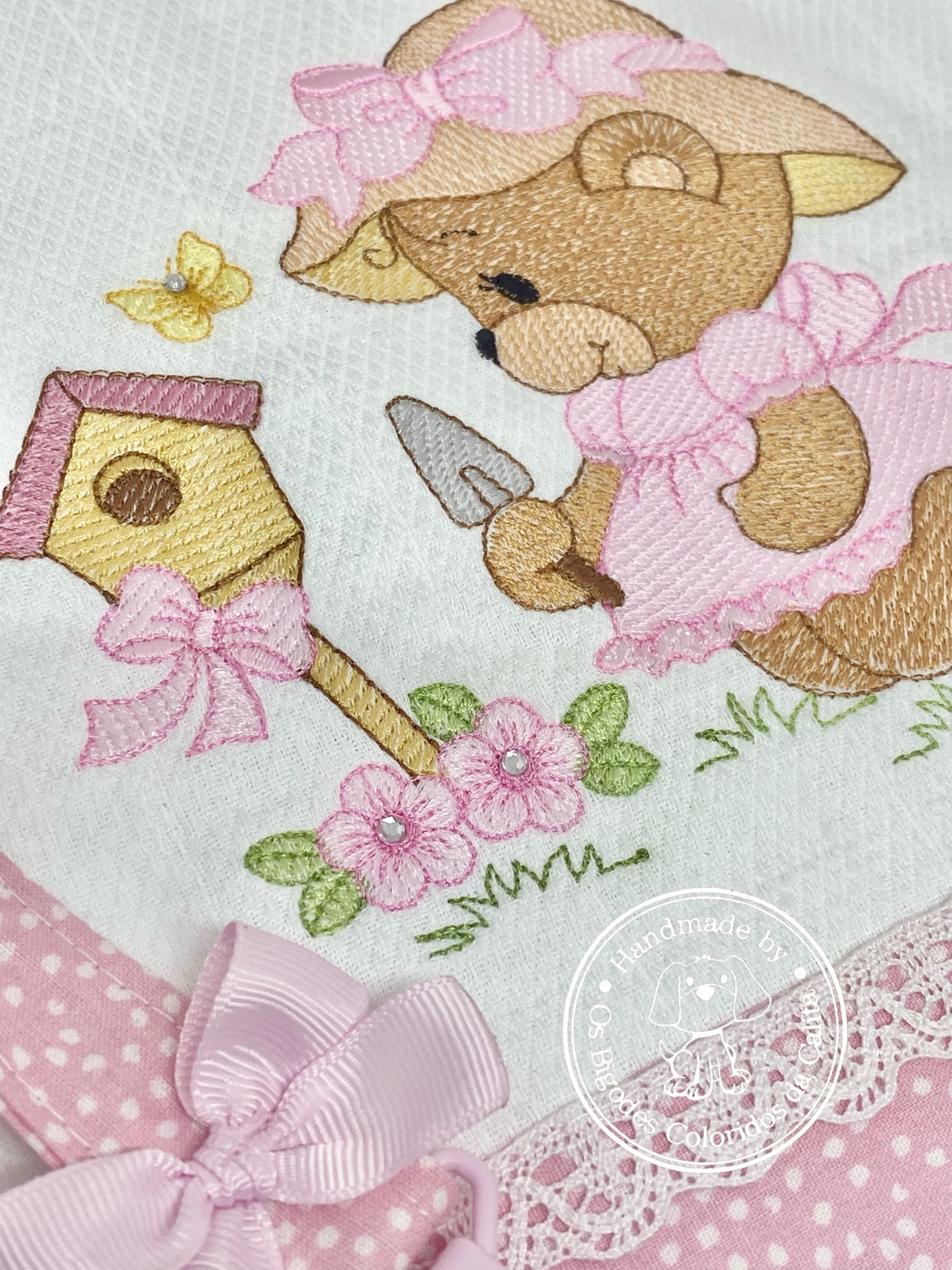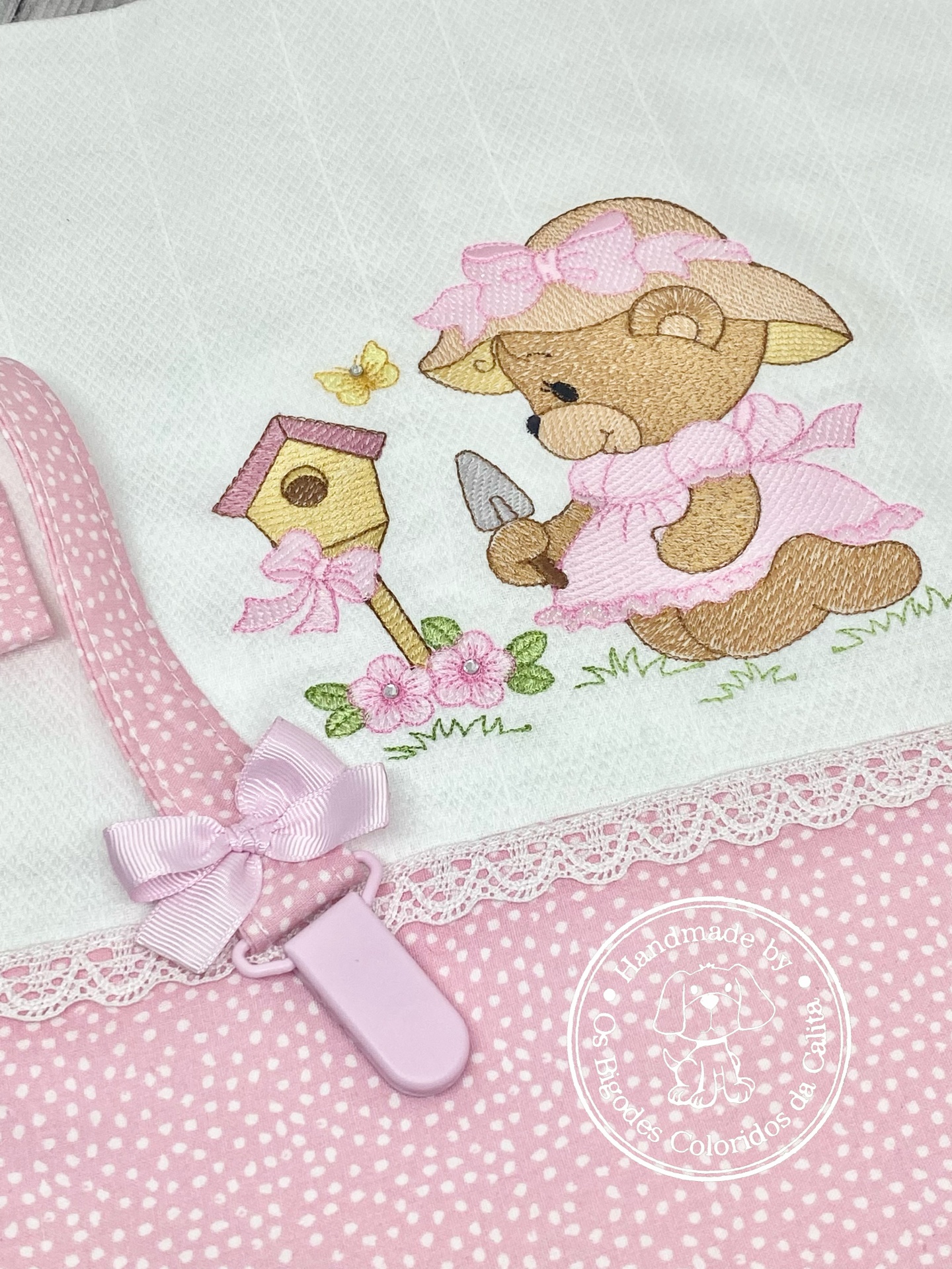 Conjunto composto por fralda de algodão bordada e prende chucha
