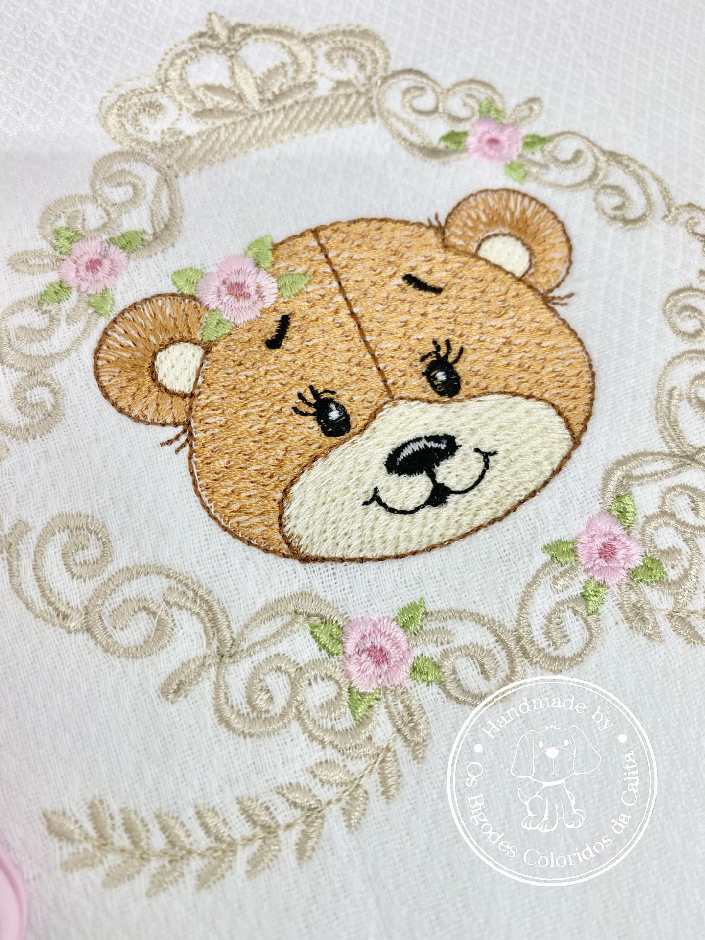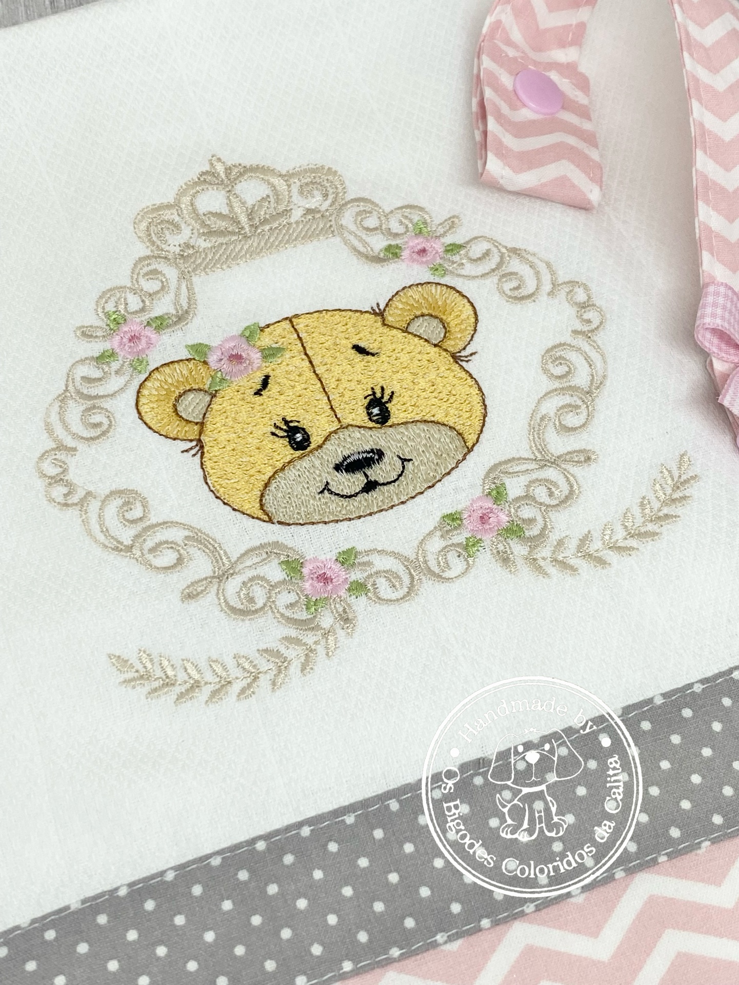 Conjunto composto por fralda de algodão bordada e prende chucha